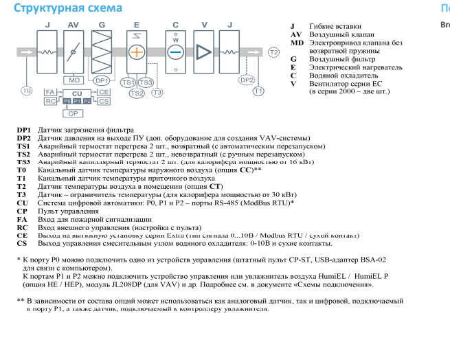 | Совместимое оборудование | Дополнительное оборудование TPD-Gate Шлюз Modbus RTU - Modbus TCP с проводным Ethernet подключением (на базе пульта TPD) ALL EXTRA Все вытяжные установки Breezart сбалансированные по производительности ALL HE P Увлажнители Breezart с электрическим пред- и постнагревателем, увлажнители Carel humiSteam JL208DP Модуль на 4 зоны для создания VAV-системы (в комплекте трубка 1м и адаптер) 85G-F7 Внешняя секция для фильтра тонкой очистки F7 |