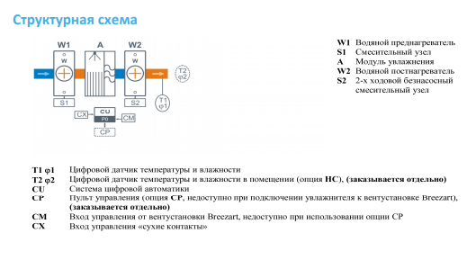 | Совместимые опции | Совместимые опции HC Поддержание влажности по датчику темп. и влажн. (каскадный регулятор), датчик заказывается отдел... BCF Система подачи биоцида CP Управление увлажнителем Breezart с пульта (заказ. отдельно), вкл./выкл. по сухим контактам |