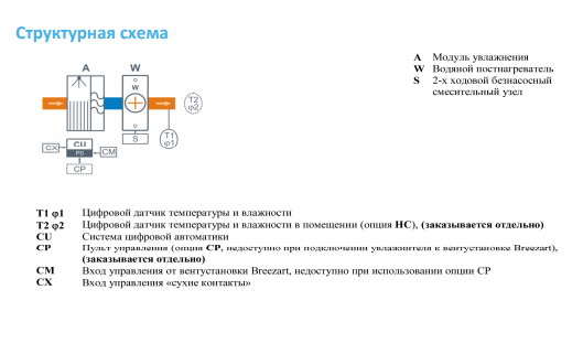| Совместимые опции | Совместимые опции HC Поддержание влажности по датчику темп. и влажн. (каскадный регулятор), датчик заказывается отдел... BCF Система подачи биоцида CP Управление увлажнителем Breezart с пульта (заказ. отдельно), вкл./выкл. по сухим контактам |