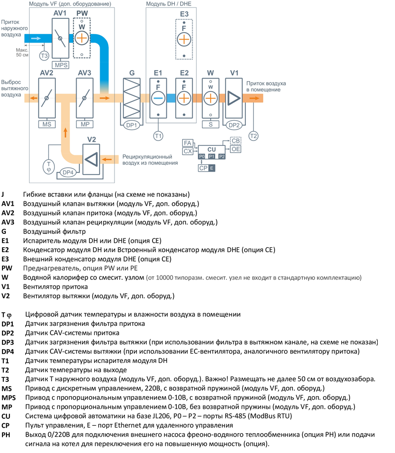 | Совместимые опции | Совместимые опции PH – Водяной конденсатор для нагрева воды в бассейне WT – Задание температуры воздуха в помещении по температуре воды в бассейне PW – Дополнительный водяной калорифер (преднагреватель – ограничитель) PE – Выход управления дополнительным электрическим калорифером (до 6 кВт) CF – Дополнительный фреоновый охладитель и управление ККБ CW – Дополнительный водяной охладитель (вместо опции CF) CE – Выносной конденсатор и переключение тепло-холод CEP – Высокопроизводительный реверсивный тепловой насос с выносным конденсатором CQ – Выносной водоохлаждаемый конденсатор и перекл. тепло-холод (вместо опции CE) EH – Электрический калорифер, устанавливаемый вместо водяного калорифера (до 6 кВт) |